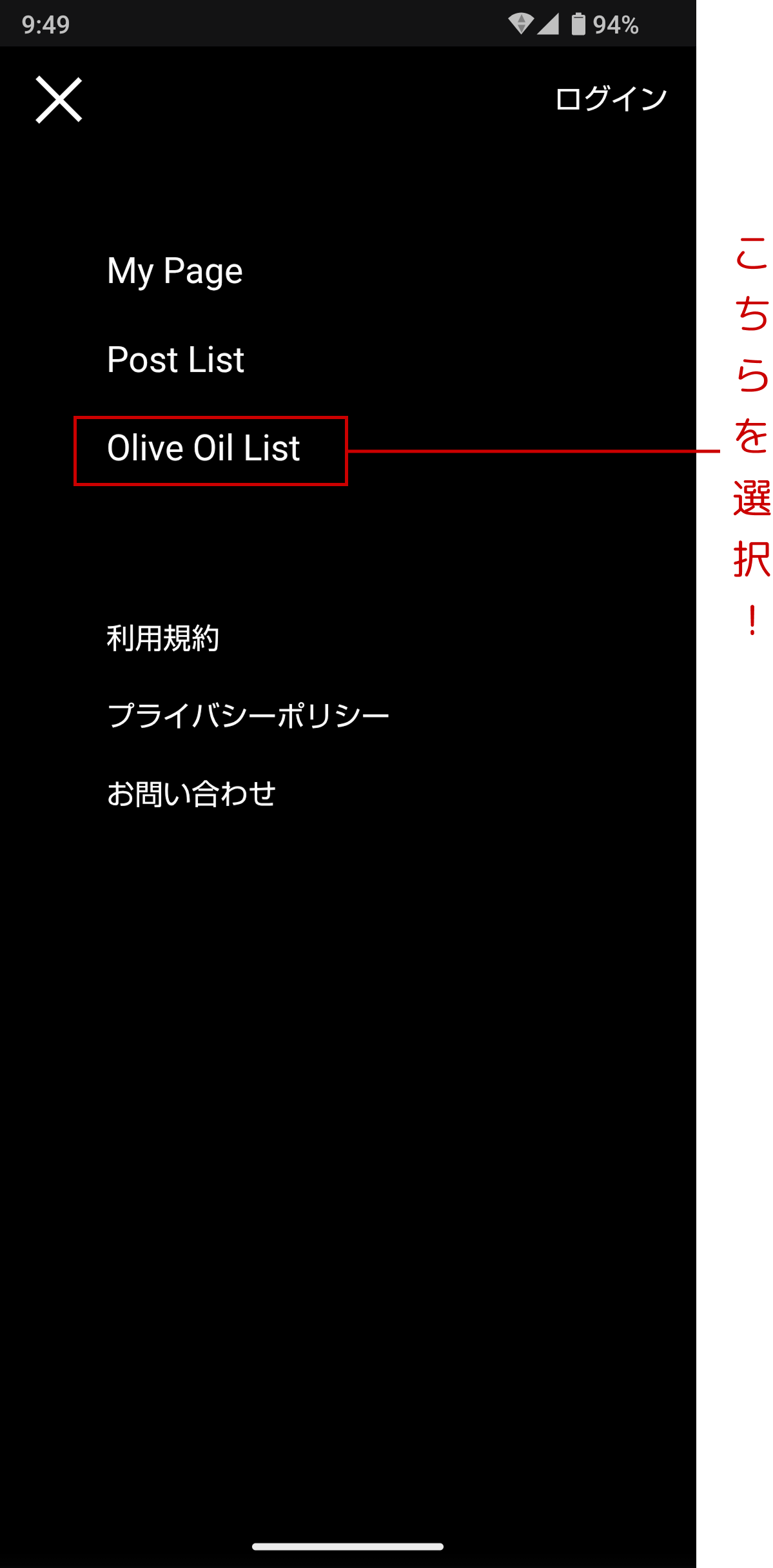 上部のヘッダーメニューから、Olive Oil Listをタップします。