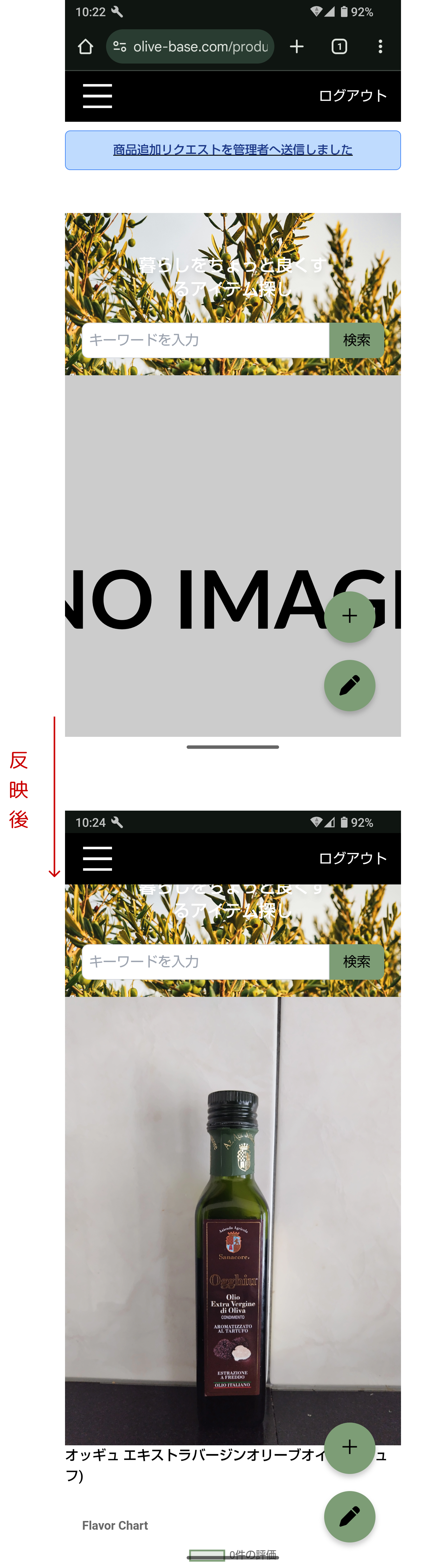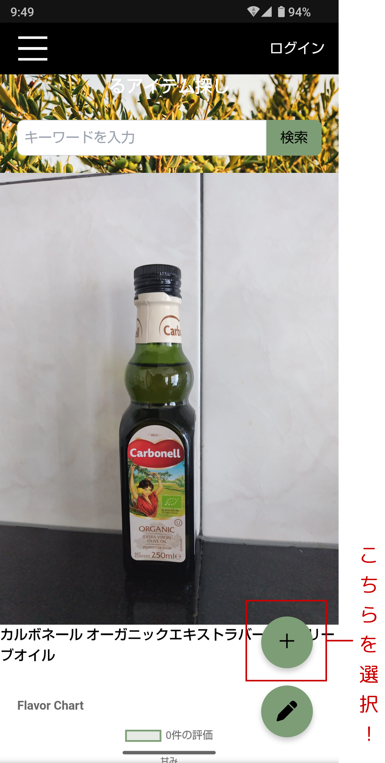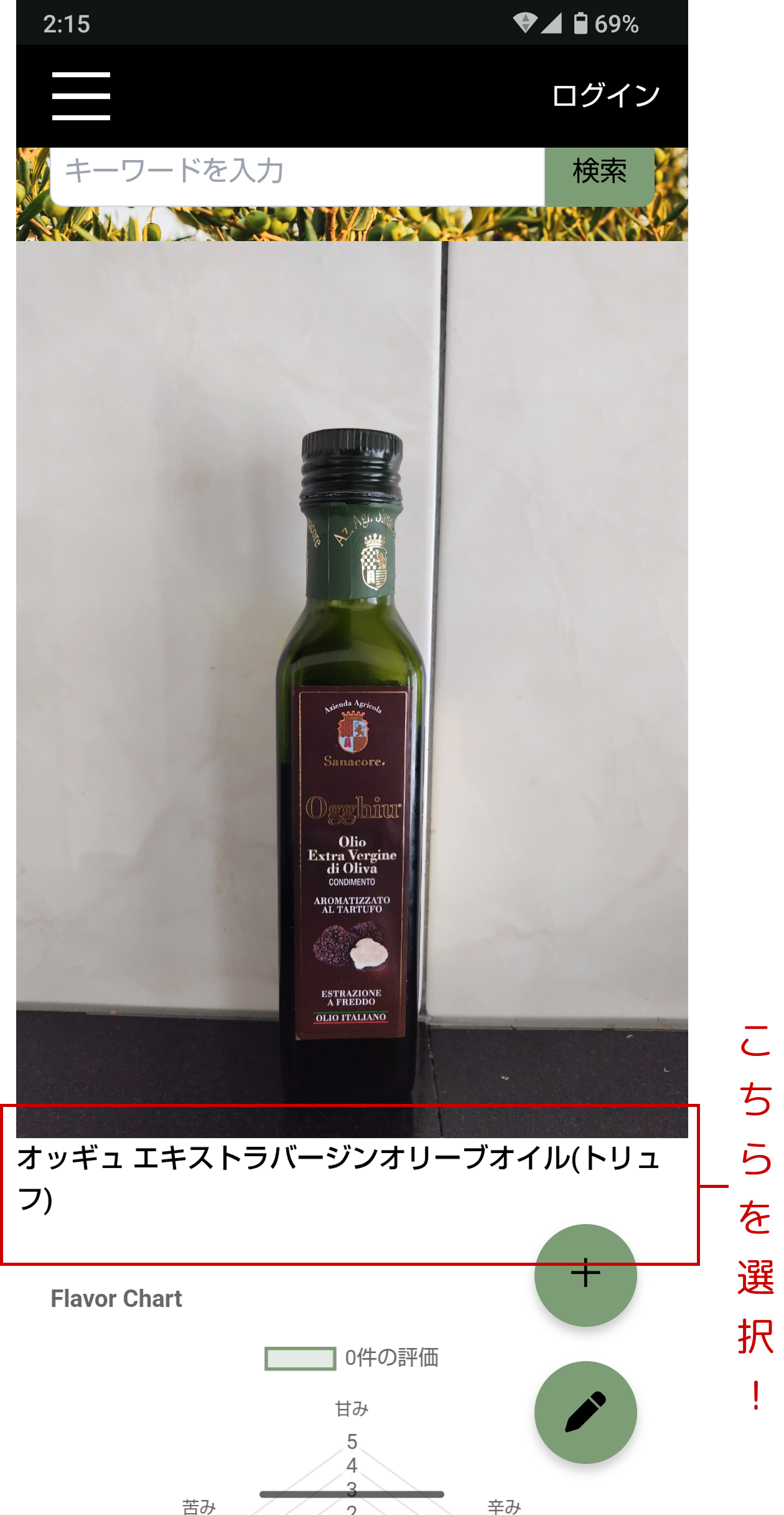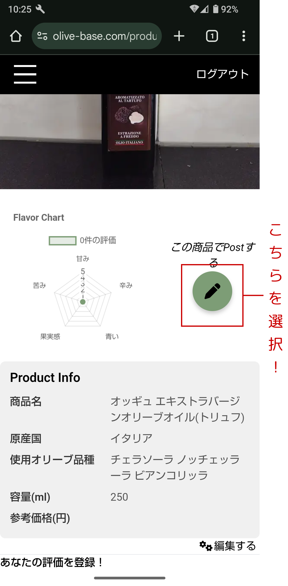 Olive Oil Listからレビューしたい商品を探し、商品名をタップ。商品詳細ページへ移動します。