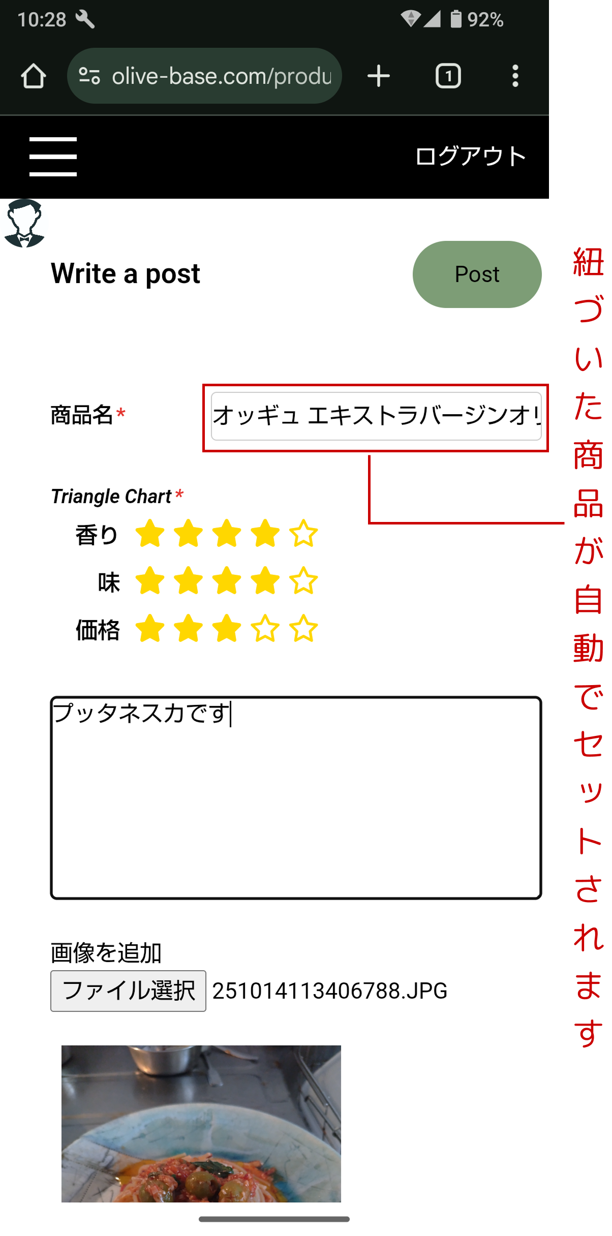 画像テキストに加えて、レビューしたいオリーブオイルを紐付けてPostすることができます