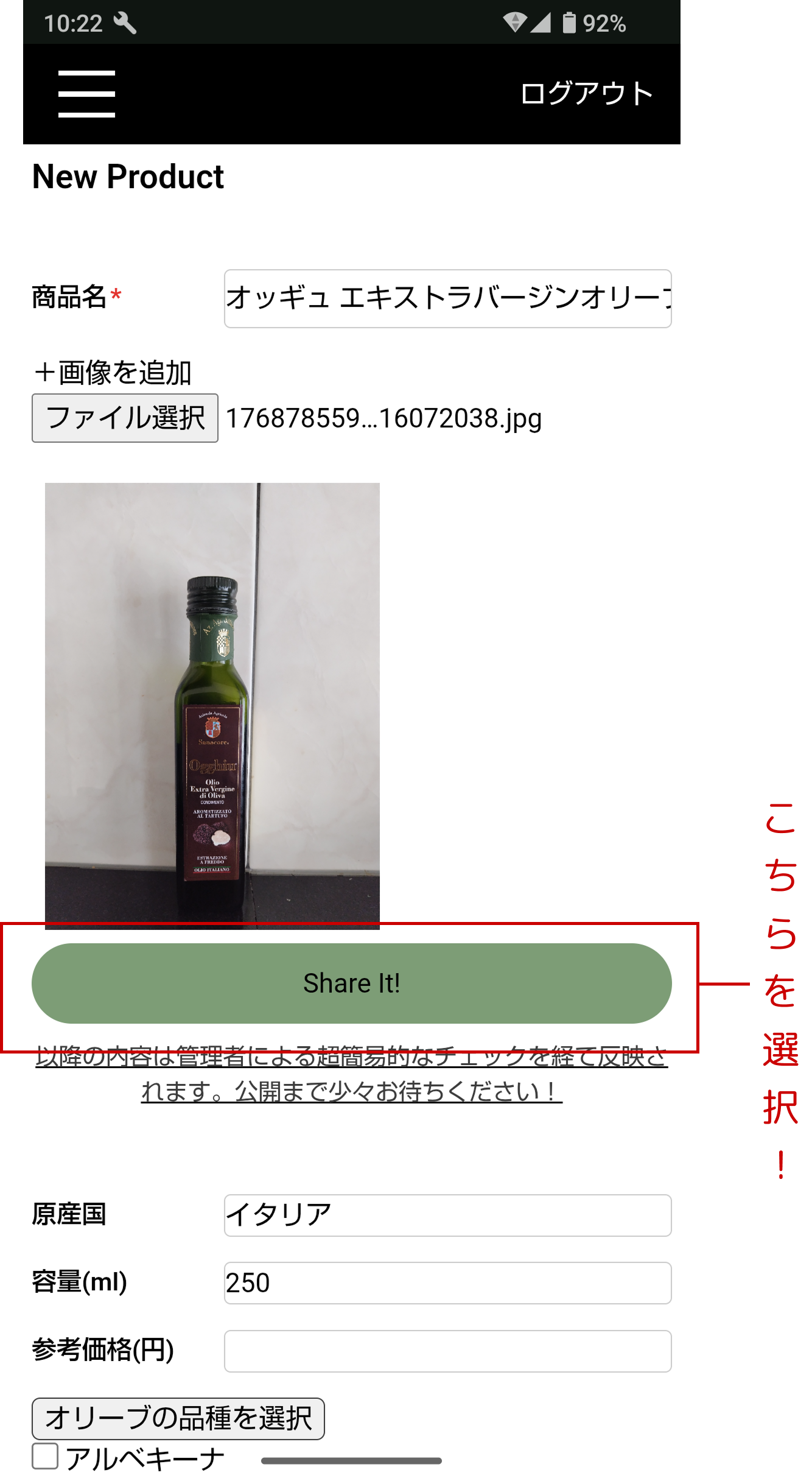商品名のほかに、原産国やオリーブの品種を入力する欄があります。分かる範囲で入力し、「Share it!」をタップしてください。